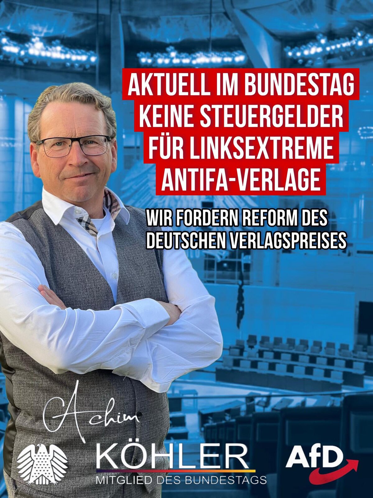 Wir setzen uns dafür ein, dass staatliche Kulturförderung nicht länger extremistische Strukturen unterstützt. Mit Steuergeldern dürfen keine Verlage finanziert werden, die Hass, Gewalt oder linksextreme Ideologie verbreiten. Kulturförderung muss neutral, transparent und verantwortungsvoll erfolgen. Ich fordere von der Bundesregierung eine klare Haltung: Kein Steuergeld für Extremismus.