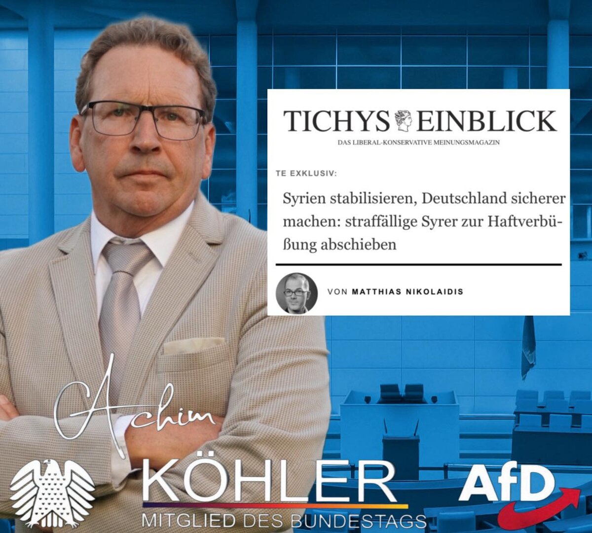Tichys Einblick greift unsere Initiativen auf: Gemeinsam mit meinen Kollegen Markus Frohnmaier und Steffen Kotré setze ich mich im Deutschen #Bundestag dafür ein, dass straffällige Syrer ihre Haftstrafe künftig im Herkunftsland verbüßen.